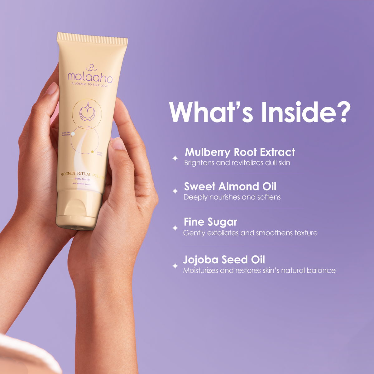 Fine Sugar, Caprylic/capric Triglyceride, Cyclopentasiloxane, Isopropyl Myristate, Olive Oil Peg-7 Esters, Glycine Soja (soybean) Oil, Morus Alba (mulberry) Root Extract (o/s), Prunus Amygdalus Dulcis (sweet Almond) Oil, Simmondsia Chinensis (jojoba) Seed Oil, Silica, Dimethicone, Fragrance, Butylated Hydroxytoluene.